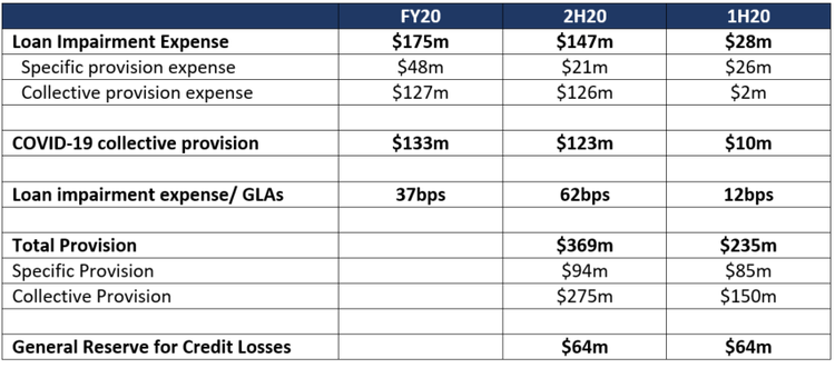 The FY20 COVID-19 related collective provision totals $133m, comprising a $10m provision in 1H20 and a further $123m provision in 2H20. This is expected to reduce the CET1 ratio by 39 basis points (bps), with CET1 ending the year comfortably above the target range of 9.0% - 9.5% due to strong 2H20 organic capital generation which broadly offsets this reduction.