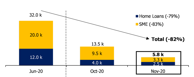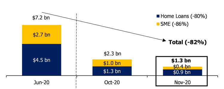 As at 30 November 2020 BOQ has 2,500 housing loans remaining in deferral with balances of $889m. These balances represent 3% of BOQ’s housing loan portfolio. BOQ has 3,300 SME loans remaining on deferral with balances of $390m as at 30 November 2020. These balances also represent 3% of BOQ’s total SME lending.