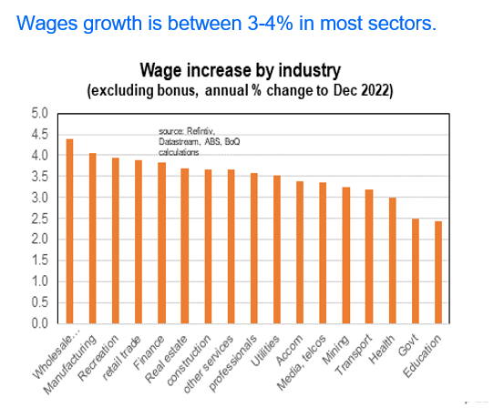 The outcome was that wages growth is rising but not at the rate that the RBA and financial markets had been anticipating. The quarterly growth rate of 0.8% is only modestly stronger than it was at the end of 2021. The annual wages growth rate of 3.4% is consistent with a return of inflation of 2-3%. One reason that wages growth has not been stronger has been the lid being kept on public-sector salaries. But wages growth in the private sector still only rose by 3.6% over the year to December 2022 (and 0.9% in the quarter). And wages growth was above 4% in only two sectors in 2022 (wholesale trade and manufacturing).