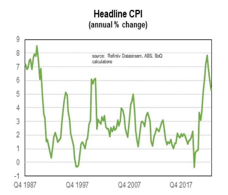 It was not all bad news. The growth in goods prices (removing the volatile items) continues to slow and services inflation might have started to fall. Tradeable goods continues to decline in line with ongoing improvement in global supply-chain problems. on-tradeable goods and service inflation appears to have peaked. All of this suggests that further slowing in the inflation rate in coming quarters is likely. For example, the experience of the US suggests that furniture inflation in Australia is likely to slow further (and could decline) in coming months.