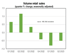 The volume of retail sales fell in Q2 2023. That was the third successive quarterly decline, only the second time that has happened in the past forty years. The only other time was in 2008. Maybe the GFC played a role then although I suspect rising interest rates was the bigger culprit.