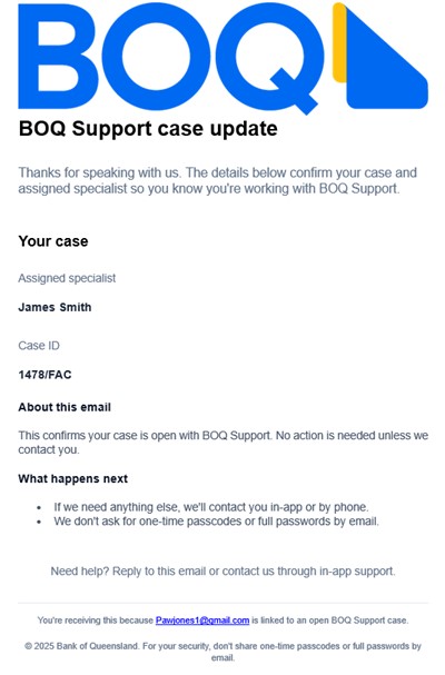- Suspicious Email: Email follows the call, branded as BOQ and sent from support@boq