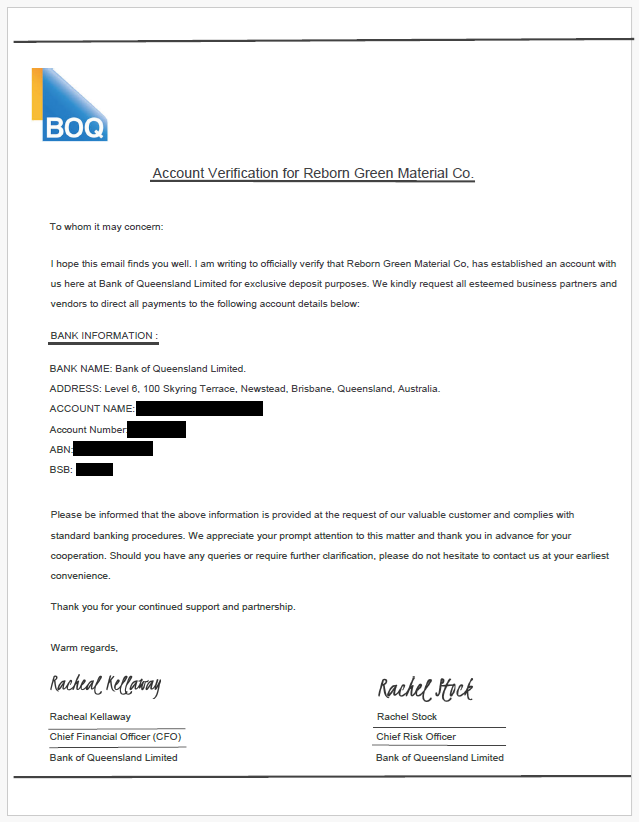 BOQ Group is warning customers about a scam involving forged documents impersonating senior executives. Customers have reported receiving emails appearing to be from Racheal Kellaway, BOQ’s Chief Financial Officer, and Rachel Stock, BOQ’s Chief Risk Officer. These documents falsely verify accounts and use BOQ branding and forged executive signatures to appear legitimate.